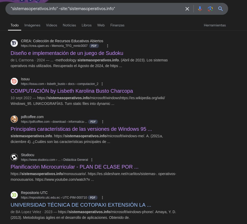 Aquí vemos un montón de menciones a mi sitio y sería cuestión de ir una a una revisando que todas tengan el enlacito. Muchas son proyectos y trabajos de estudiantes, pero se cuelgan en sitios web de autoridad (incluso de las propias escuelas) y eso nos puede ayudar bastante.