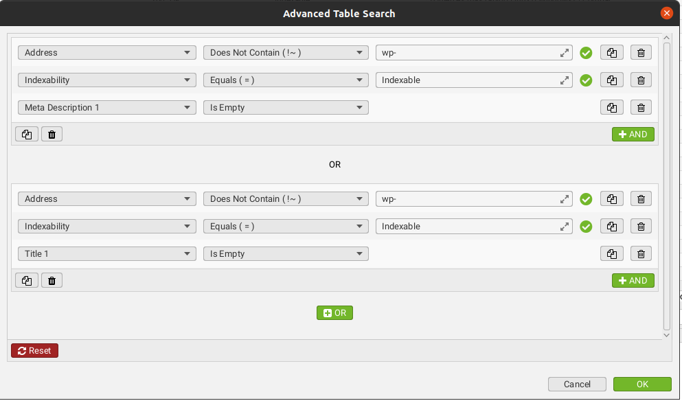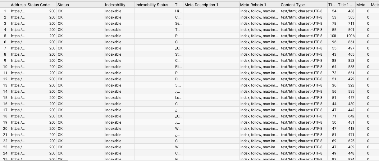 Como ya os comenté, podemos aplicar una serie de filtros a Screaming Frog para que nos dé las URL que nos interesan, en este caso me interesan las que no tengan “wp-”, que sean indexables y que tengan metatítulo o metadescripción en blanco.
