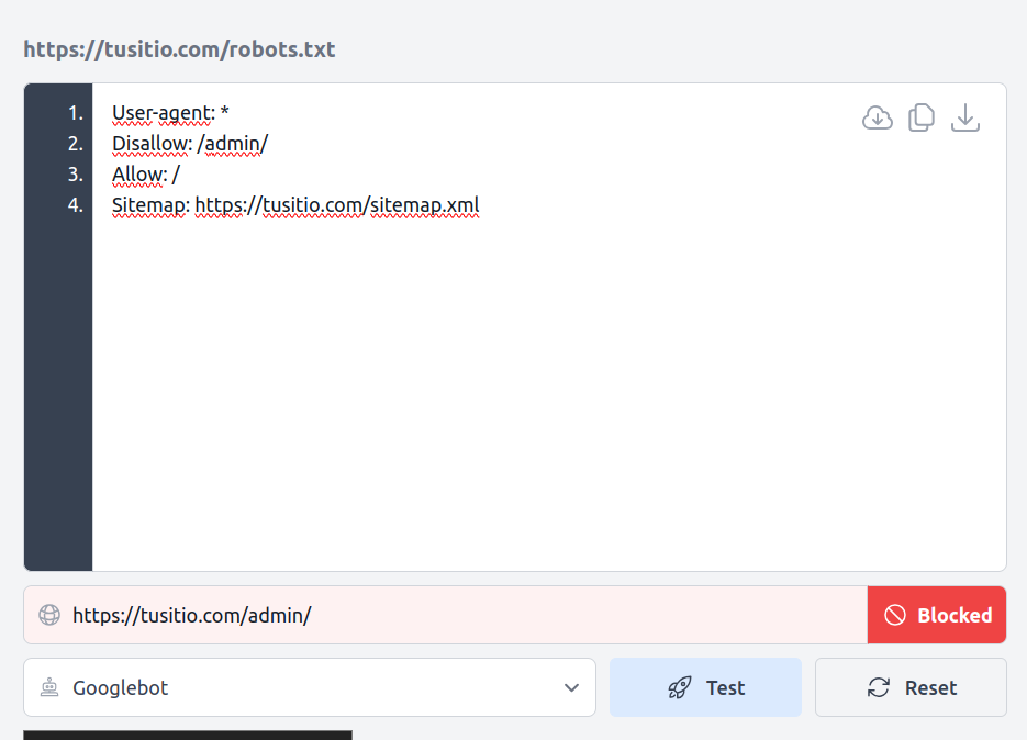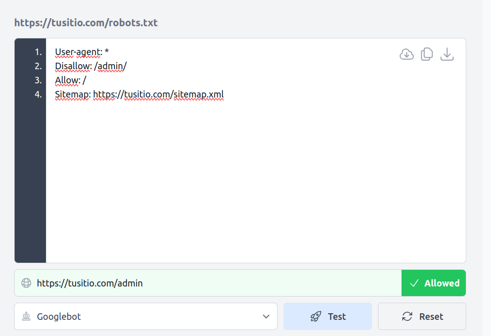 Sitemap: https://tusitio.com/sitemap.xmlEn este caso, le estamos diciendo a todos los bots (User-agent: *) que no accedan al directorio /admin/, pero permitimos el resto del contenido y les damos el enlace a nuestro sitemap.